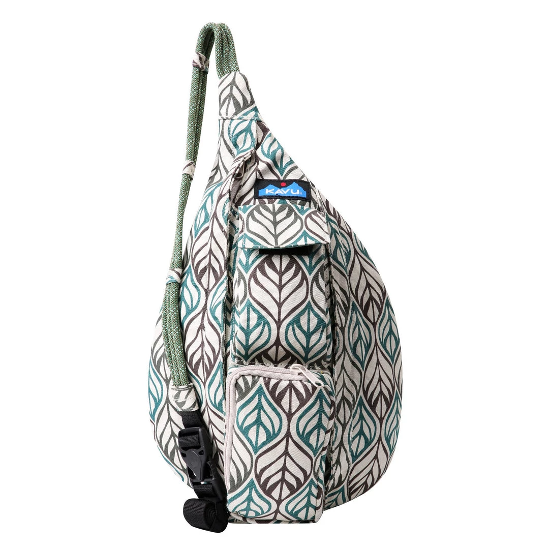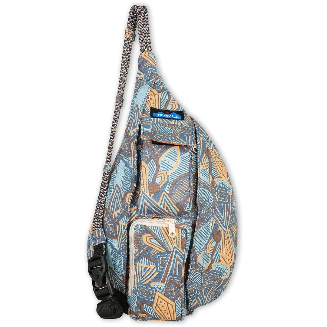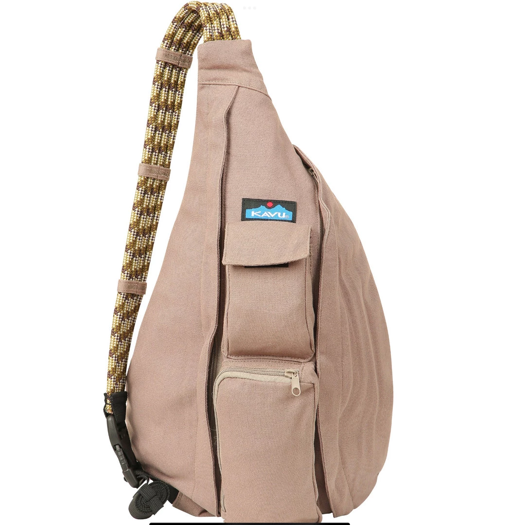 This mini sling cotton canvas pack features adjustable rope shoulder strap with side release buckle, two vertical zip compartments, two key or cell phone pockets, padded back with KAVU embroidery.